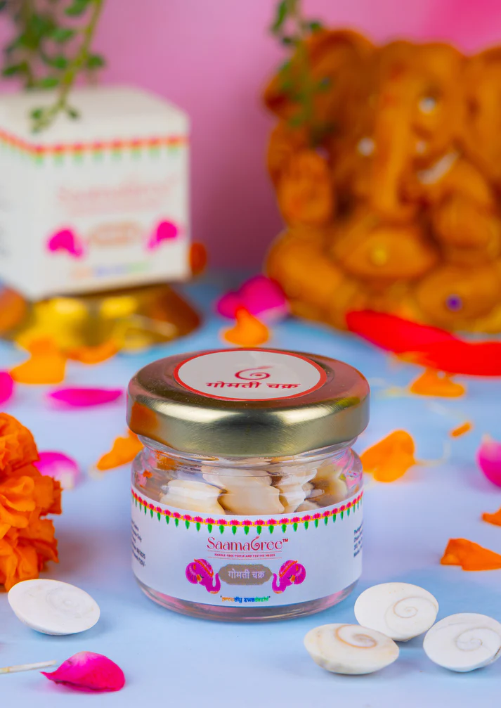 SAAMAGREE Gomti Chakra is a rare natural spiritual stone associated with the Sudarshan Chakra of Lord Vishnu and believed to carry the blessings of Goddess Lakshmi. Revered in Hindu traditions, Gomti Chakra is known to attract wealth, promote prosperity, and protect against negativity and evil energies. Benefits & Spiritual Significance: Brings financial stability and abundance Shields from evil eye, Vastu dosh, and negative energy Enhances spiritual aura and inner strength Invites peace, harmony, and success into home and business Favors good luck when kept in wallets, cash boxes, lockers, or pooja space