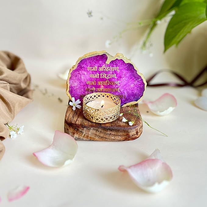 Elevate your spiritual space with this Handcrafted Namokar Mantra Tea Light Holder, beautifully crafted using natural pink agate stone and mounted on a solid wooden base. Engraved with the sacred Namokar Mantra, this elegant décor piece symbolizes peace, compassion, and spiritual purity. When lit, the tea light casts a warm, soothing glow through the pink agate, creating a calming and devotional atmosphere. Ideal for Jain pooja rooms, meditation corners, living spaces, and offices, this handcrafted piece also makes a thoughtful gift for festivals, housewarmings, and corporate occasions.