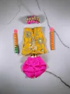 Celebrate the vibrant spirit of Navratri with the divine elegance of the Garba Shakti Yellow Jacket Dress for Laddu Gopal. Inspired by the joyous energy of Garba nights and the sacred devotion of festival rituals, this outfit brings together tradition, color, and festive charm in one stunning ensemble. Crafted in a unique jacket-style design, this poshak features intricate embroidery and festive detailing, paired with a coordinated dhoti and turban to complete the look of Thakur Ji. The bright yellow hue symbolizes energy, positivity, and auspicious beginnings, making it perfect for Navratri celebrations. Designed with love and care, this dress ensures a comfortable fit and graceful drape, allowing your Laddu Gopal Ji to shine with divine charm. Whether for temple rituals, home पूजा, or festive décor, this attire beautifully reflects devotion and celebration. Bring alive the magic of Garba and devotion—dress your Laddu Gopal in radiant festive elegance.