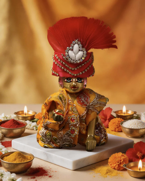 Celebrate the divine energy of Navratri with the vibrant Navratri Shakti Yellow Red Jacket Dress for Laddu Gopal Ji, a beautifully crafted poshak inspired by the festive spirit of devotion and joy. The striking combination of auspicious yellow and powerful red symbolizes prosperity, strength, and divine blessings, making it perfect for sacred celebrations. Designed in a traditional jacket-style ensemble, this dress features intricate embroidery and fine detailing that enhances the divine charm of Thakur Ji. Paired with a matching dhoti, turban, and festive accessories, it reflects the grandeur of Garba nights and the devotion of Navratri rituals. Handcrafted with care in Mathura, this poshak brings together tradition, comfort, and elegance—ensuring your Laddu Gopal Ji shines with divine radiance during every pooja and celebration.