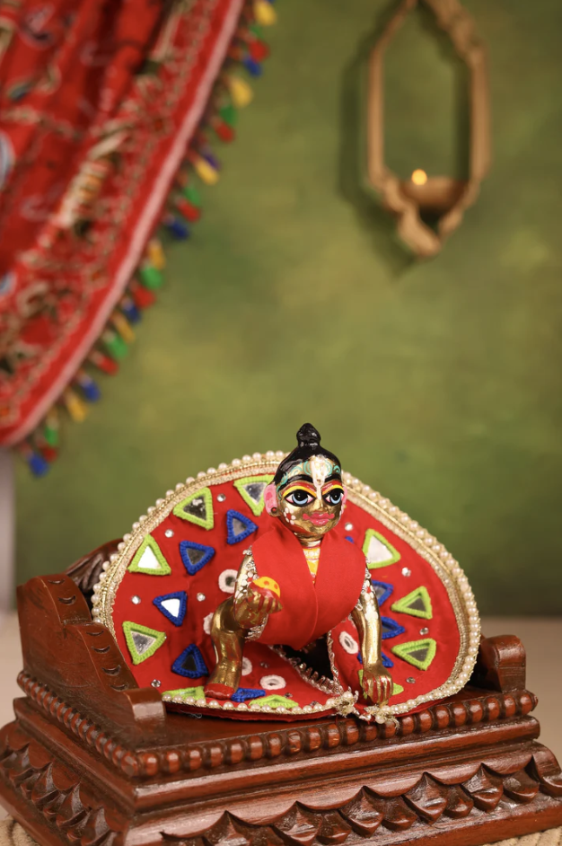 Celebrate the vibrant spirit of Navratri with the Rangilo Red Laddu Gopal Poshak. Crafted from soft cotton and adorned with traditional Kutch mirror embroidery, this festive attire reflects the rhythm and joy of Garba nights. The bold red color symbolizes devotion, strength, and auspicious energy, making it a perfect choice for dressing your beloved Gopal Ji during special occasions. Every detail of this handcrafted poshak radiates cultural charm and festive cheer, bringing the same colorful vibrancy that lights up Raas-Garba celebrations into your home temple.