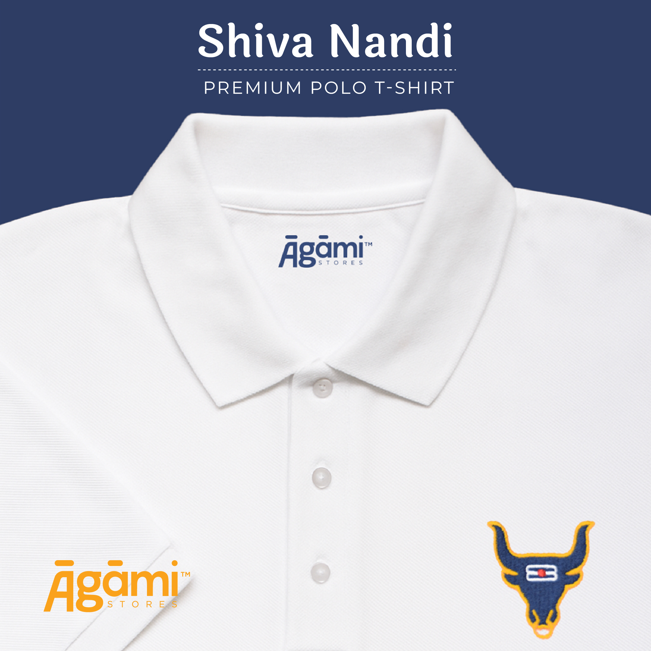 "A premium white polo neck t-shirt featuring the sacred Shiva Nandi design. Made from 100% bio-washed cotton, this regular fit tee ensures comfort, durability, and a stylish spiritual vibe. Perfect for casual wear, temple visits, or gifting to Shiv devotees."
