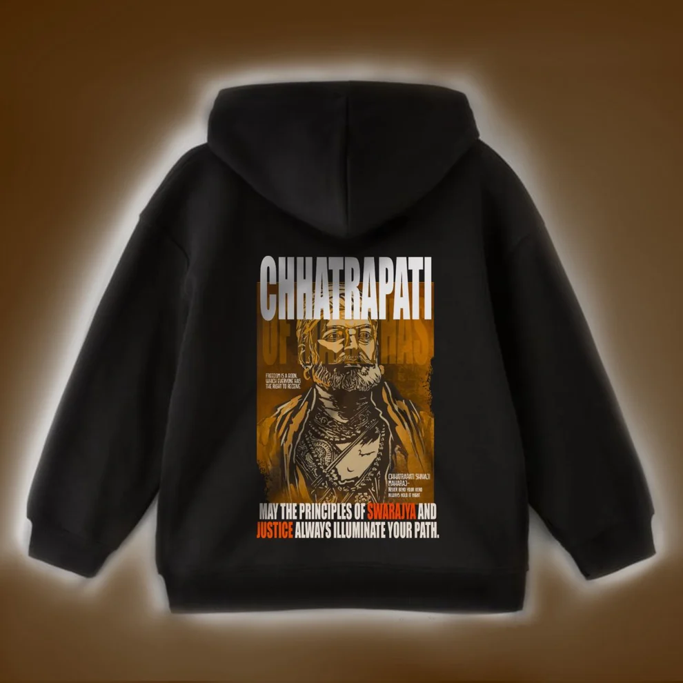 Legacy of Fire. Spirit of Swarajya. This oversized black hoodie is a tribute to the indomitable legacy of Chhatrapati Shivaji Maharaj, the visionary who laid the foundation of Swarajya through courage, strategy, and unwavering resolve. The bold graphic design reflects strength, resilience, and the eternal pride of the Marathas. Crafted from premium black terry fabric with a relaxed oversized fit, this hoodie blends modern streetwear aesthetics with deep historical significance. Every stitch represents valor, leadership, and freedom—designed for those who walk with purpose and wear their heritage with pride. Not just a hoodie. A symbol of power, honor, and legacy.